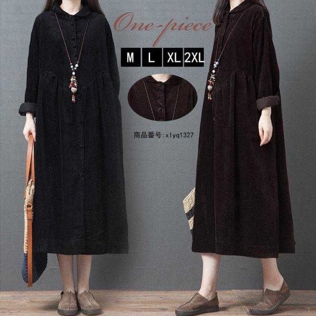 レディース ワンピース 秋冬 長袖 コーデュロイロングワンピース Aライン ロング丈 ミモレ丈 襟付き レトロ レトロガーリー フェミニン ガーリー 大人ガーリー 大人カジュアル カジュアル 秋 冬 ブラック S Xlサイズ Op 1793 Y